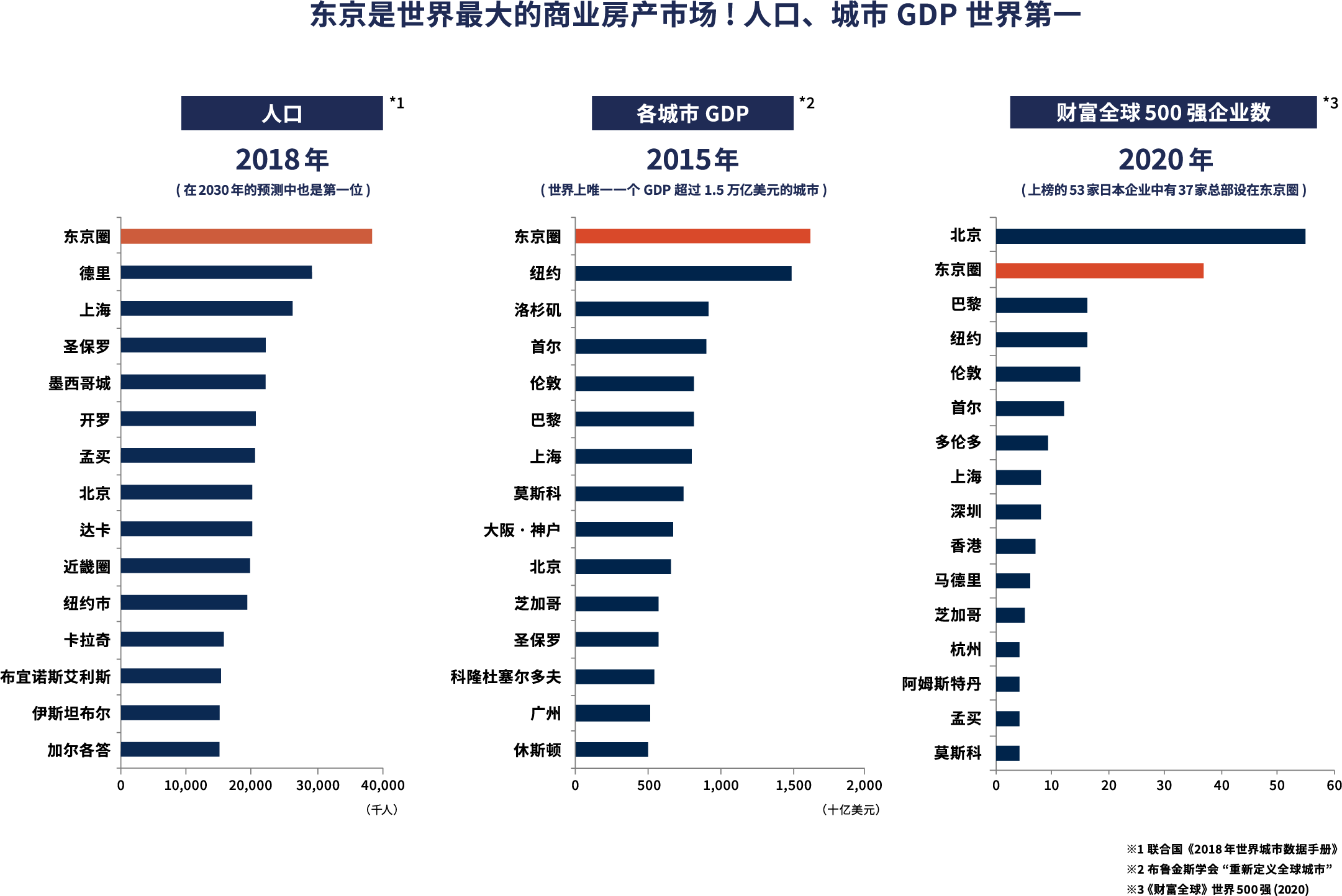 人口向东京圈集中带来了“企业集聚”,成为东京巨大经济市场的基础。 2015年,东京的经济规模超过纽约等城市名列第一, 甚至超过了经济规模居世界第10位的加拿大。 由于大部分企业都在东京市中心设立办事处,所以预计今后对东京都中心商业地段的房地产需求也会持续下去。 建议您充分利用日本的这一特征,在东京以持有不动产来拥有资产。