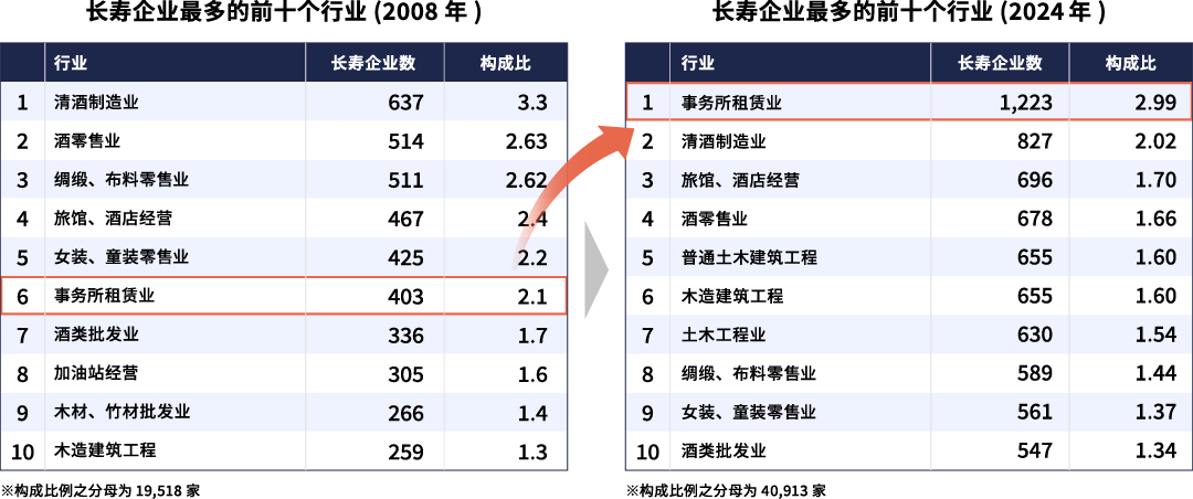 日本创业百年以上的长寿企业在这16年间增加了约2万1000家。其中“写字楼租赁业”的增加率特别高,在所有行业和业态中拥有最多的长寿企业数。