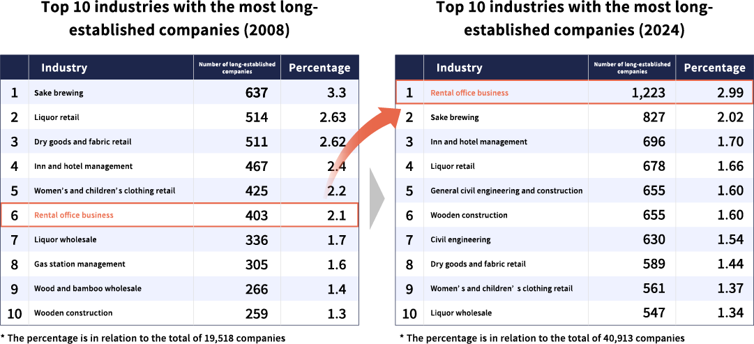 The number of centennial companies in Japan has increased by approximately 21,000 over the past 16 years. The growth rate of the "office leasing industry" is particularly high, with the largest number of long-lived companies among all industries and business categories. This is because many of these firms were not in the rental office business as their primary business, but changed their business type as revenues from the rental office business increased over the years.