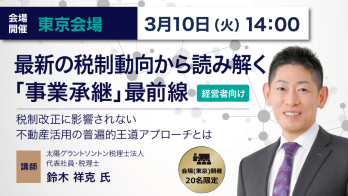 【会場開催】太陽グラントソントン税理士法人 × 株式会社ボルテックス 共催 <経営者向け>最新の税制動向から読み解く「事業承継」最前線 税制改正に影響されない不動産活用の普遍的王道アプローチとは