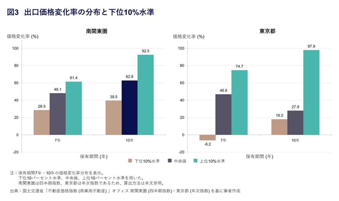 図3において、南関東圏および東京都の過去データに基づき、保有期間7年および10年における出口価格変化率の分布を、下位10パーセント、中央値、上位10パーセントのシナリオとして提示します。