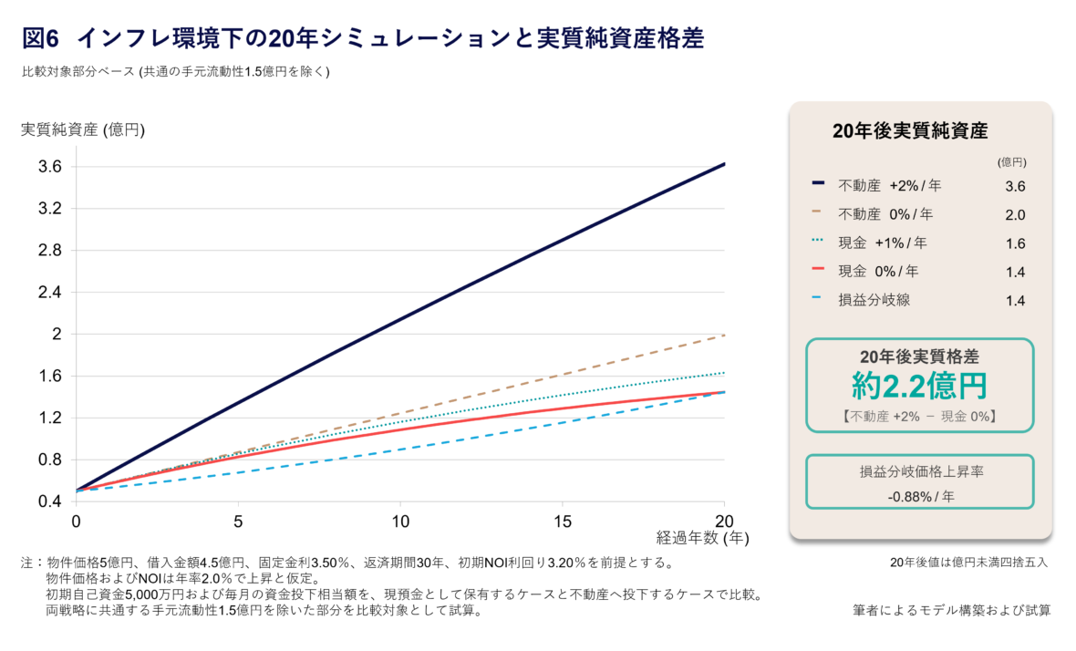 インフレ率が年率2.0パーセントで推移するマクロ経済環境を前提に置きます。図6の試算は、図2と同一の借入条件、すなわち物件価格5億円、借入金額4.5億円、固定金利3.50パーセント、返済期間30年、初期NOI利回り3.20パーセントを前提とし、物件価格とNOIがともに年率2.0パーセントで上昇すると仮定します。市況の好転による過度な値上がり益を捨象し、インフレによる純粋な負債圧縮効果のみを抽出するため、不動産価格の年間上昇率についてはインフレ率と同水準の2.0パーセントという厳格な条件を設定しました。また、物価上昇に連動する市場金利の引き上げと、将来の借り換え時における調達コストの増大リスクを理論的に隔離するため、20年間の全期間固定金利で資金調達を完遂できたという特例的な境界条件を本シミュレーションの前提として付与しています。