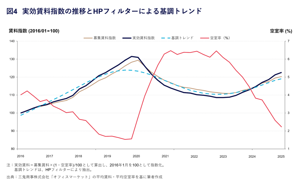 図4では、募集賃料指数と空室率から算出した実効賃料指数、同指数から抽出した基調トレンド、募集賃料指数および空室率の推移を対比して示します。