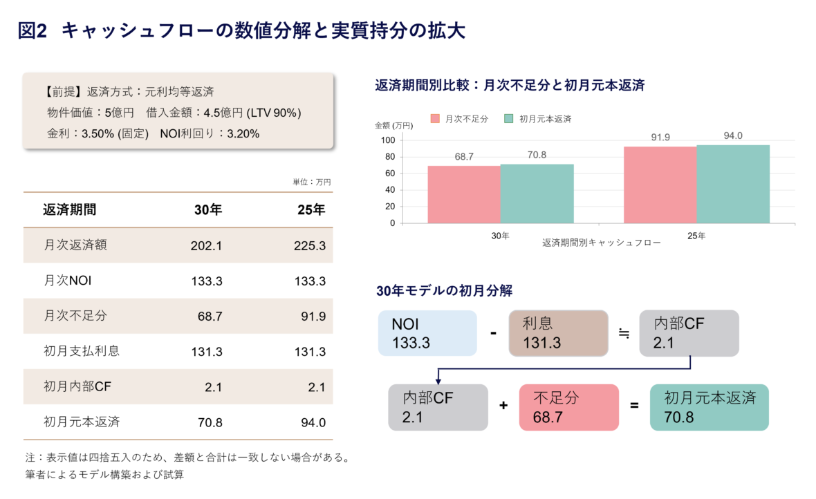 試算の前提条件は、物件価格5億円、借入金額4.5億円(LTV90.00パーセント)、調達金利3.50パーセント固定、税引前NOI利回り3.20パーセント、元利均等返済と定義します。この条件下において、返済期間の差異が月次不足分と、実質持分の拡大ペースを示す初月の元本返済額に与える影響を比較検証した結果を、図2に示します。以降の本文における数値例は、元本償還期間を30年とした計算モデルに準拠します。調達金利3.50パーセントという設定値は、支払利息がNOIに拮抗する限界的な水準を意図的に選択したものです。狙いは、キャッシュフローが大幅なマイナスに陥る環境でも、元本返済による実質持分への資産転送が数学的に成立するかを点検することにあります。