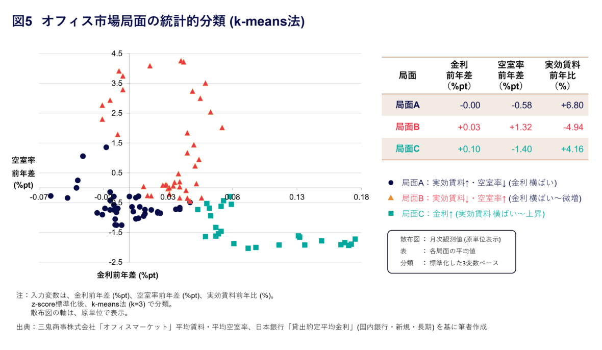 図5において、金利前年差、空室率前年差、実効賃料前年比を標準化し、k-means法を用いて市場局面を統計的に分類した結果を示します。散布図は解釈容易性のため、横軸に金利前年差、縦軸に空室率前年差を原単位で表示し、実効賃料前年比は表に併記しています。