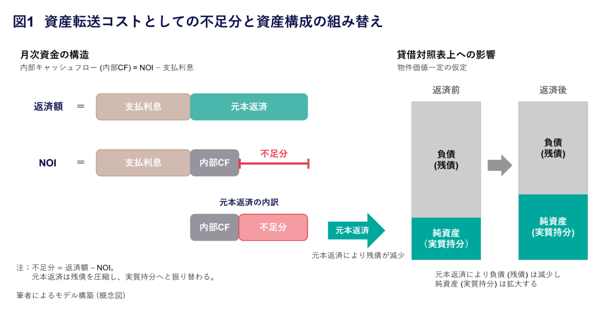 インフレ環境下における不動産投資のマイナス収支のすべてが、事業の失敗を意味するわけではありません。物件本来の収益力が支払利息を上回る一方で、物件本来の収益力だけでは元利返済額を賄いきれない局面では、月次の不足分のうち元本返済に対応する部分は、将来の実質持分を積み上げるための「資産転送コスト」として理解できます。単月ごとの現金過不足という局所的な結果に固執していては、資金循環の全体像を把握できません。評価の視点を、現金の出入りから貸借対照表が示す資産の蓄積状態へ移すと、表面的な資金の減少に惑わされず、財務の実態をより正確に評価できます。外部へ流出した現金のうち、元本返済に充てられた部分は損益計算書上の費用ではありません。元本返済へ投じられた資金は残債を直接的に圧縮し、物件価値から負債を差し引いた実質的な持分(エクイティ)を拡大させます。手元の流動性は減少しますが、同時に、負債依存度を引き下げた資本構成への移行が進みます。元本返済に対応する月次不足分は、現金を実質持分へ振り向ける資金移動として読む必要があります。