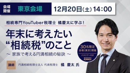 【会場+バスツアー】円満相続税理士法人 × 株式会社ボルテックス 共催 ≪相続専門YouTuber税理士 橘 慶太に学ぶ!≫ 年末に考えたい“相続税”のこと ~家族で考える円満相続の秘訣~